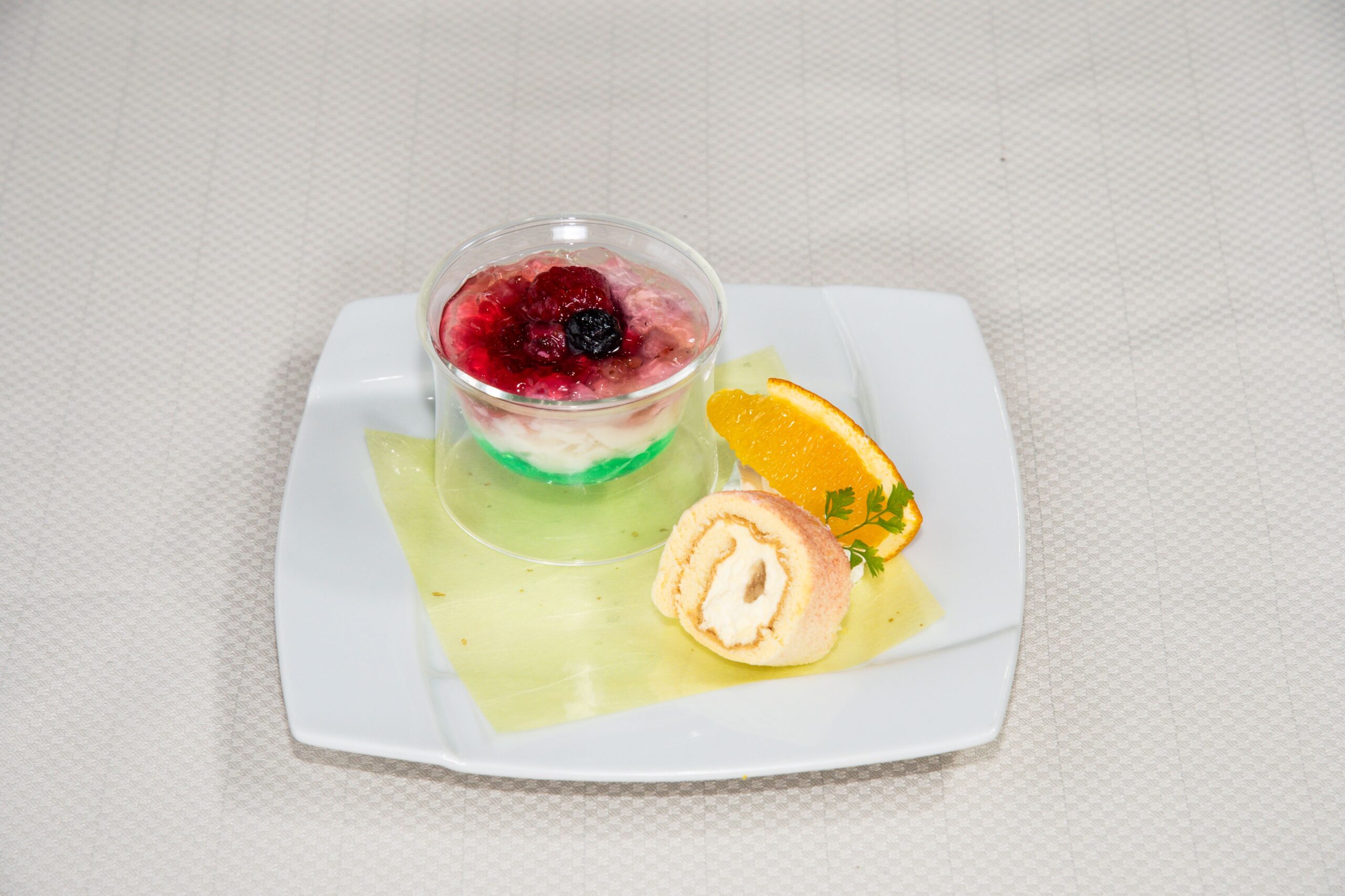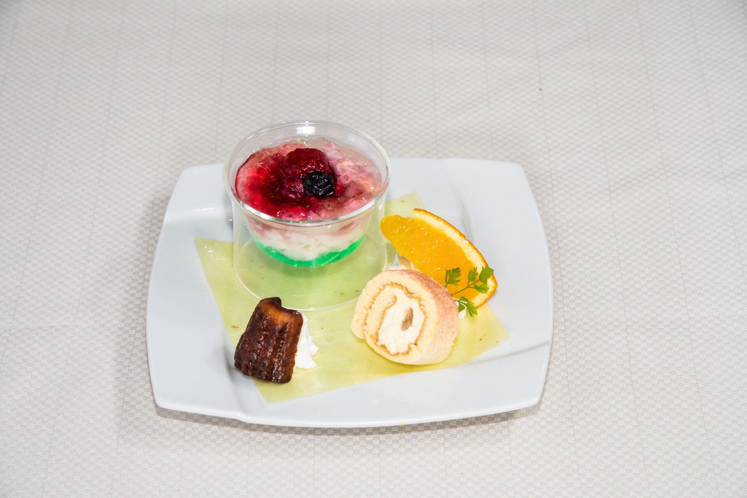 彩りピーチとライムゼリーのパンナコッタと桃ロールまたは焼き菓子 ※桃ロールまたは焼き菓子をお選びいただけます。尚、皆様ご一緒の内容にて承ります。