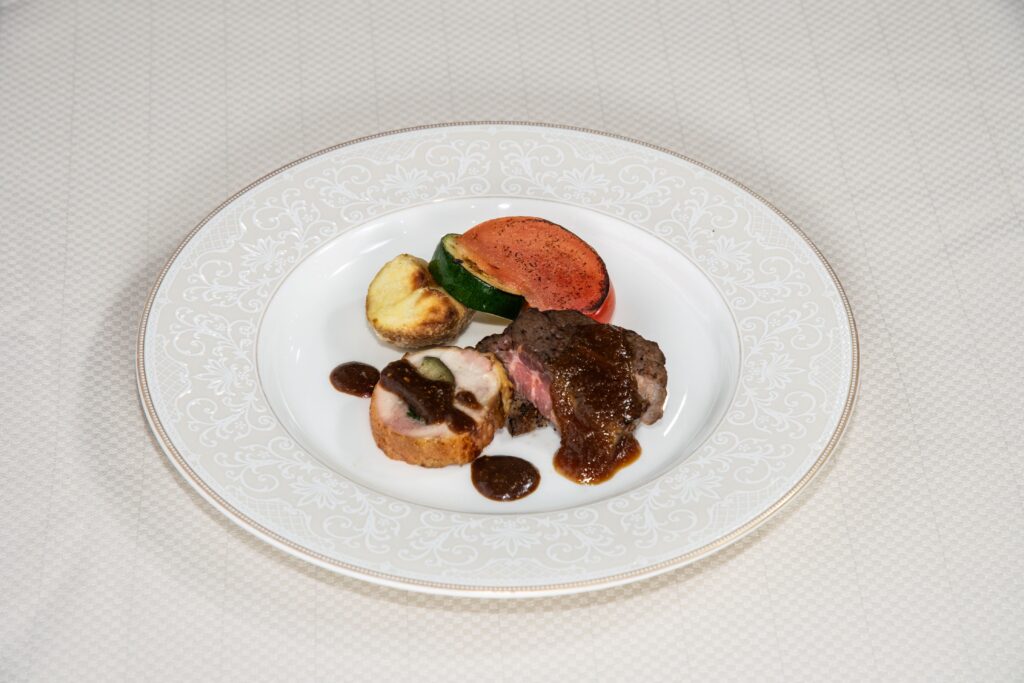 鶏肉のバロティーヌと福島牛の和風ゆずソース