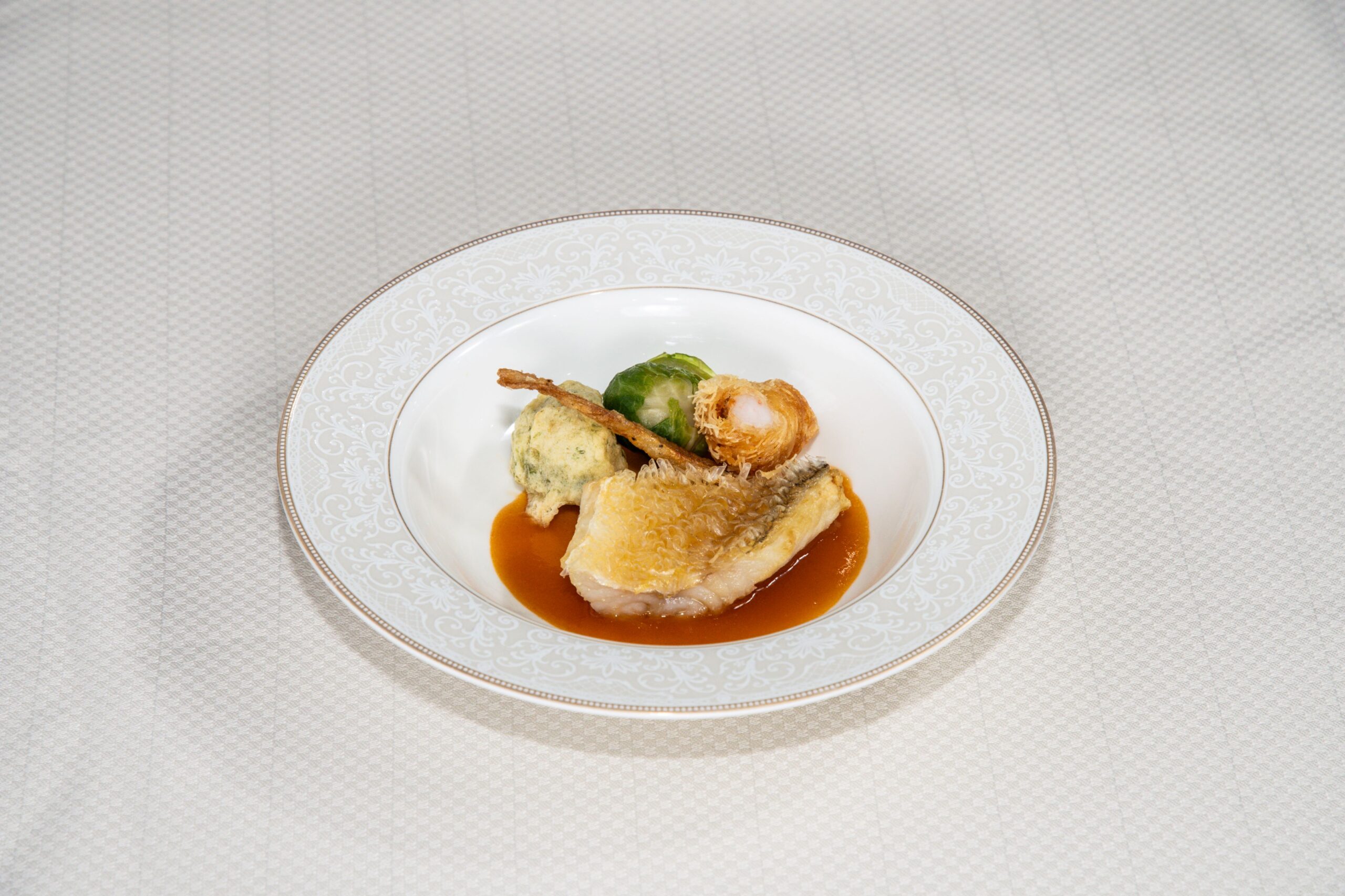 甘鯛の鱗焼きと海老のカダイフ巻き ソースアメリケーヌ