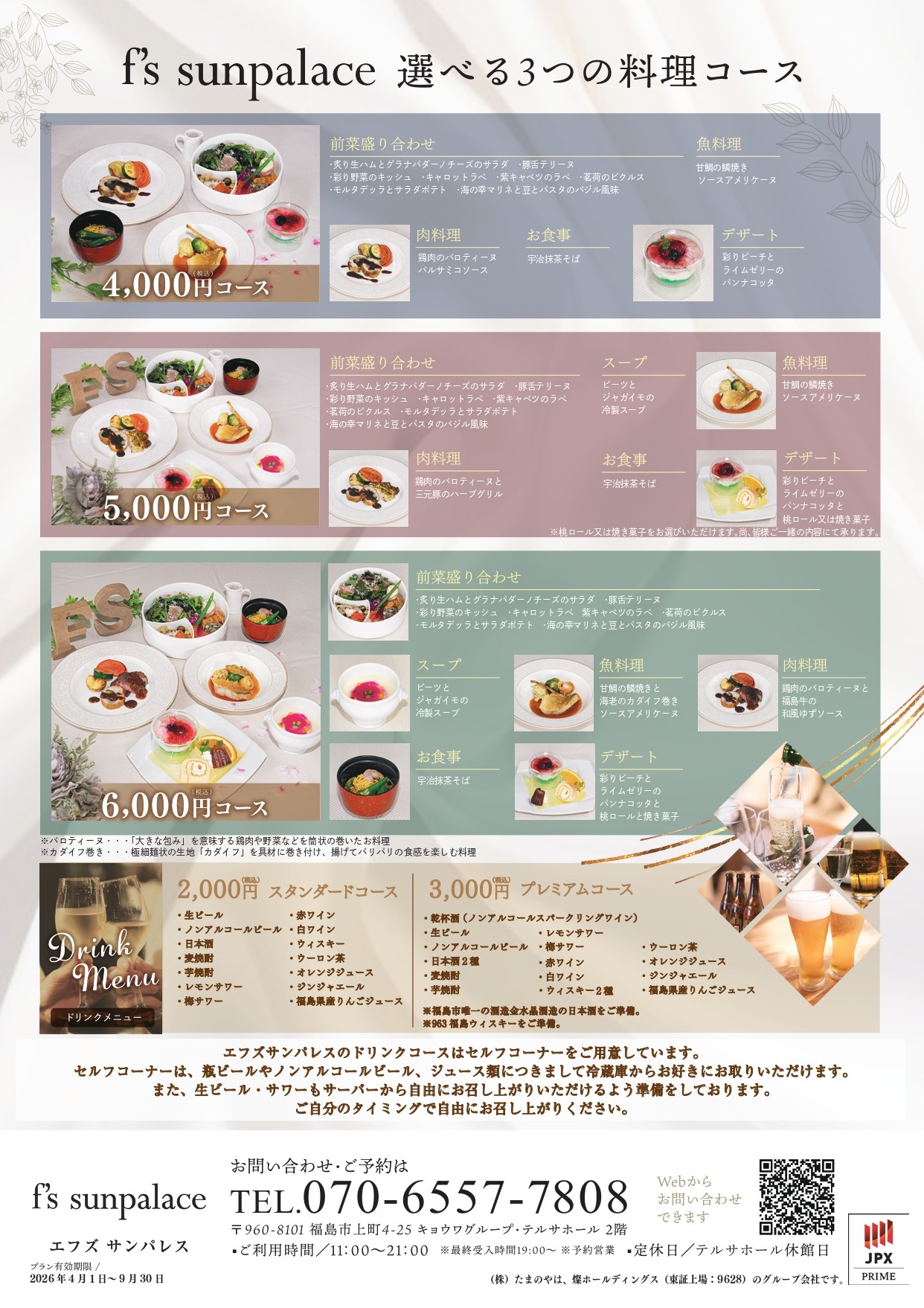 f’s sunpalace エフズサンパレスは「ふくしまのサンパレス」。 私たちは、感謝・繋がり・楽しさ・驚きが生まれる瞬間を創りたいと考えています。 エフズサンパレスのストーリーは、ウェルカムタイムからエンディングまで、 誰もが「おいしい」「たのしい」は人を幸せにしてくれる・・と感じられる宴会をプロデュースいたします。