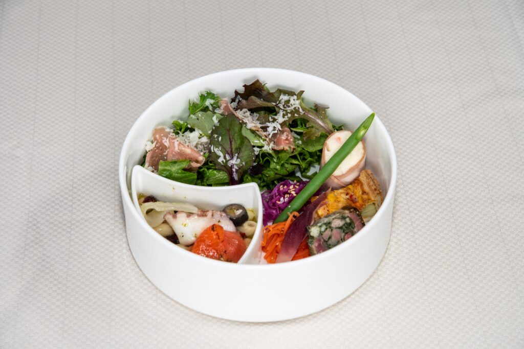 ・彩り生ハムとグラナパダーノチーズのサラダ ・豚舌テリーヌ ・彩り野菜のキッシュ ・キャロットラぺ ・紫キャベツのラぺ ・茗荷のピクルス ・モルタデッラとサラダポテト ・海の幸のマリネと豆とパスタのバジル風味